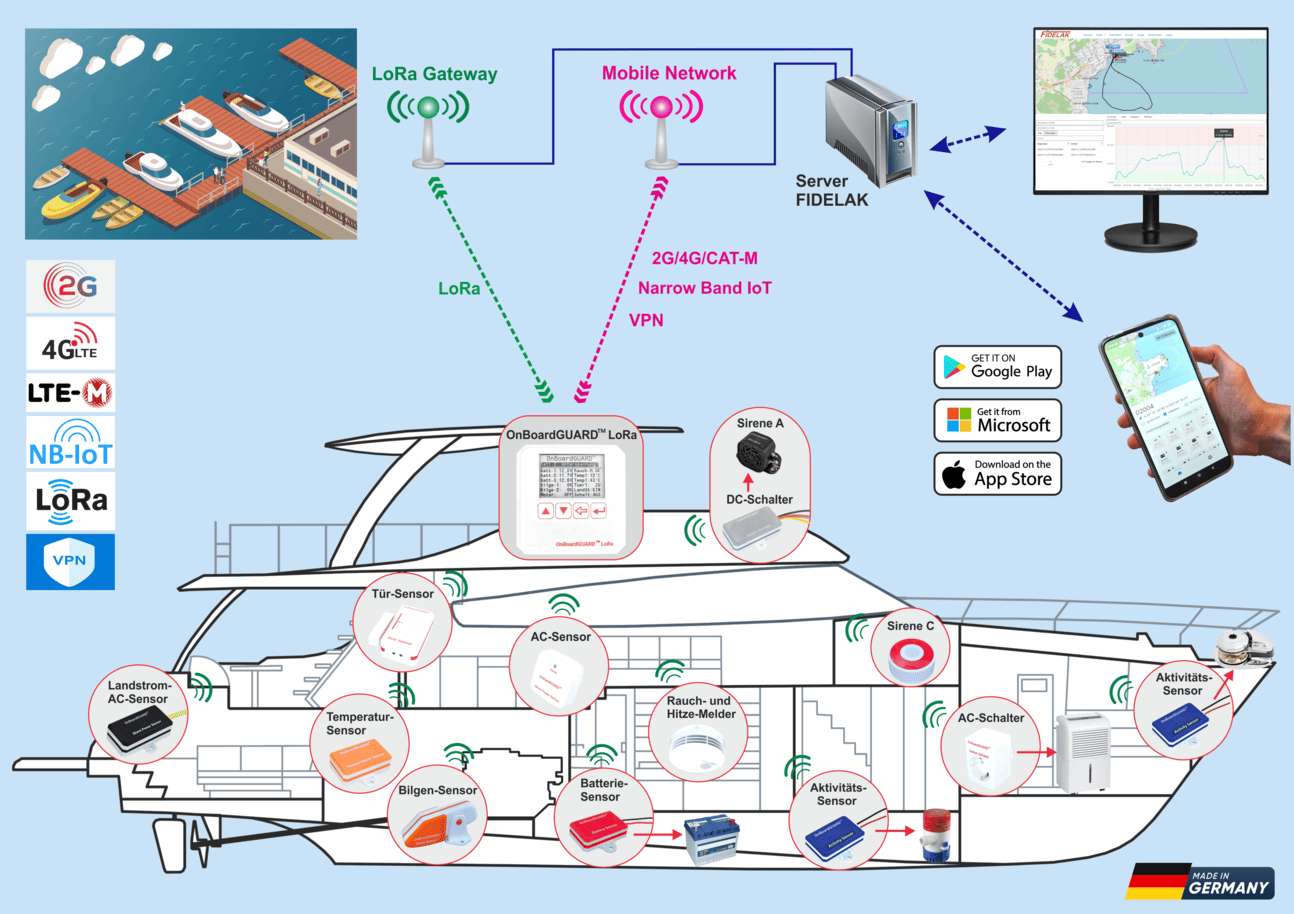 Der Yacht-Hafen kann mit dem OnBoardGUARDTM Port den Bootsbesitzern einen zusätzlichen Service bieten, wo ergänzend zur visuellen Kontrolle der Bootsliegeplätze auch die Überwachung der Batterien, die Überwachung auf Rauch oder Hitze, die Überwachung auf Eindringen von Wasser oder das Erkennen des unbefugten Eindringens ermöglicht wird. Durch die frühzeitige Erkennung von Feuer wird das Übergreifen auf benachbarte Boote verhindert. Mit dem funk- und solarbetriebenen Sensor für die Anwesenheitserkennung der Yacht am Liegeplatz steht immer die aktuelle Auslastungssituation zur Verfügung, womit auch unberechtigte Nutzung von Liegeplätzen erkannt werden kann. Die Sensoren arbeiten autark und sind über das lokale LoRa-Netzwerk mit der Marina verbunden.